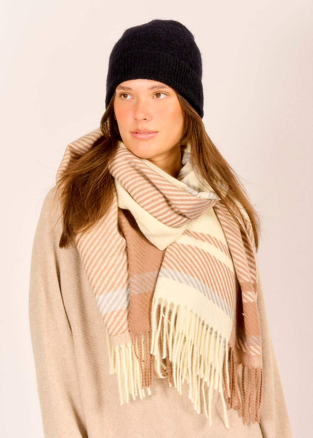 Leicht, anschmiegsam und wärmend – genau die Art von Accessoire, das man morgens umlegt und den ganzen Tag bei sich trägt, weil es sich einfach richtig anfühlt. Die Cognacnuancen veredeln dein Outfit stilvoll, ohne Aufmerksamkeit zu verlangen. Der Viskose-Anteil verleiht dem Tuch eine fließende, weiche Struktur.