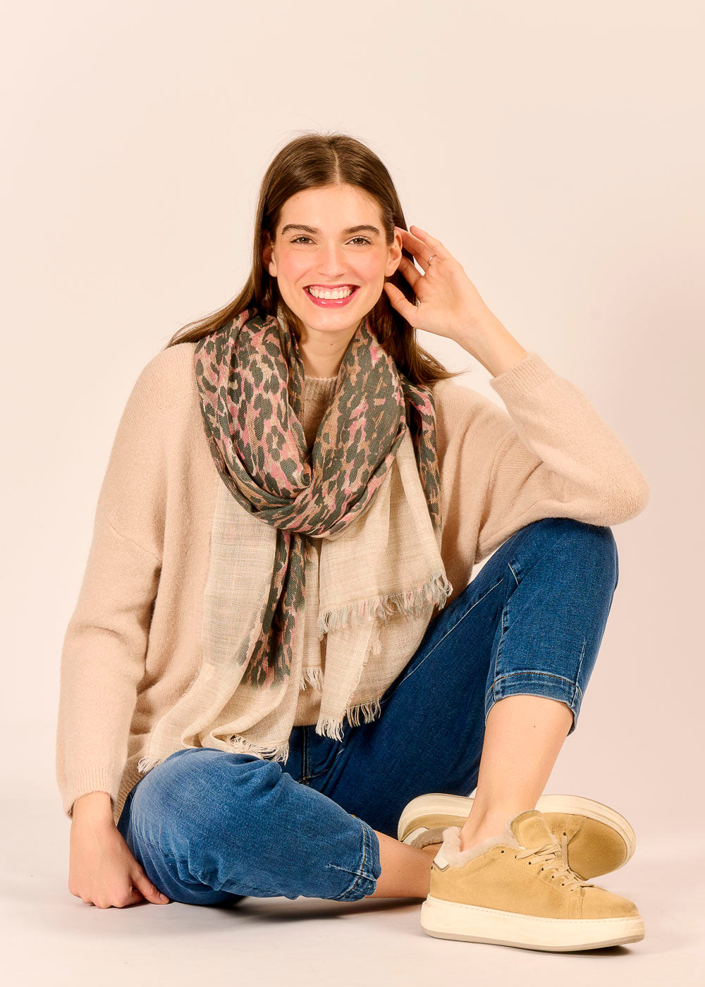 Ob locker um den Hals oder lässig über die Schultern gelegt ‒ Dieses Leo-Tuch ist das perfekte Accessoire für jede Jahreszeit. Das Trendmuster in zarten Rosa- und Beigetönen lässt sich fantastisch kombinieren.