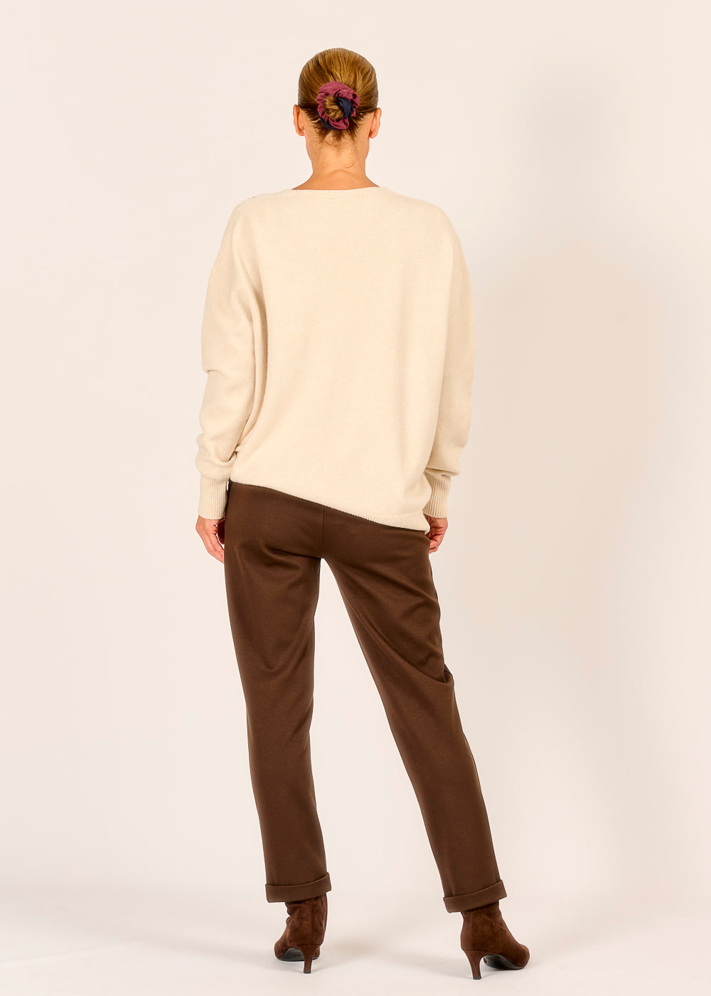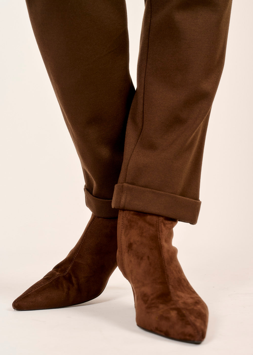Erlebe zeitlose Eleganz mit unserer edlen Pantalone in tiefem Moka. Der luxuriöse, weiche Stoff fällt fließend und bietet höchsten Tragekomfort für einen stilvollen Auftritt. Der raffinierte Turn-up am Beinabschluss verleiht der Hose eine moderne und besonders lässige Note. Kombiniert mit Stiefeln oder High Heels kreierst du einen stilvollen Look, der dich vom Büro bis zum Dinner begleitet.