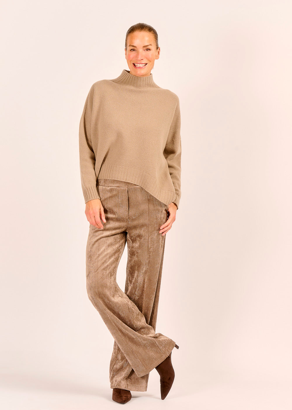 Die Cordhose in einem warmen Beigeton strahlt zeitlose Eleganz aus. Der weiche Trendstoff und die schmeichelhafte Passform machen sie zum Lieblingsstück für Casual-Looks. Besonders modern wirkt Cord mit dem passenden Pullover als monochromer Look gestylt.