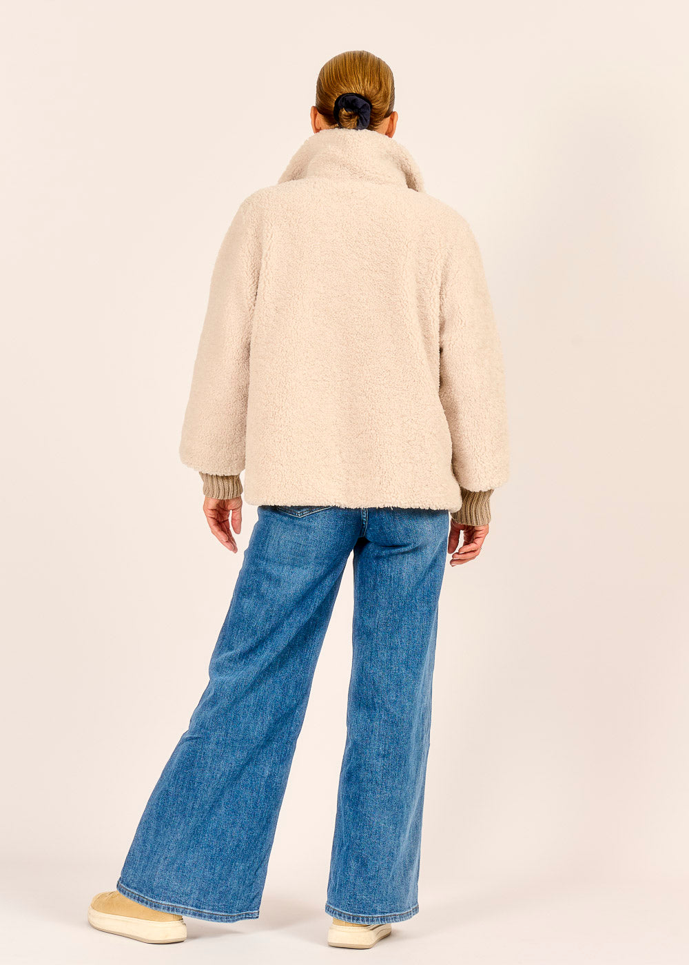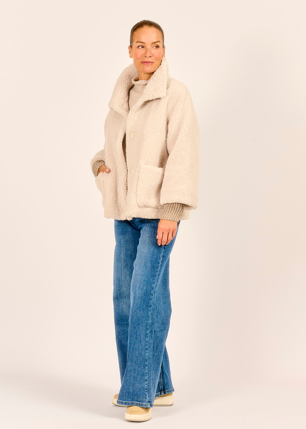 Ein absolutes Highlight für die kalte Jahreszeit: Eine kuschelige Jacke in zartem Panna, die mit ihrem weichen Teddy-Stoff sofort ein Gefühl von Gemütlichkeit vermittelt. Die breiten Strickbündchen an den Ärmeln setzen einen sportlichen Akzent und sorgen für einen angenehmen Tragekomfort. Ein vielseitiges Key-Piece, das Ihrem Look eine verspielte und zugleich stilvolle Note verleiht.