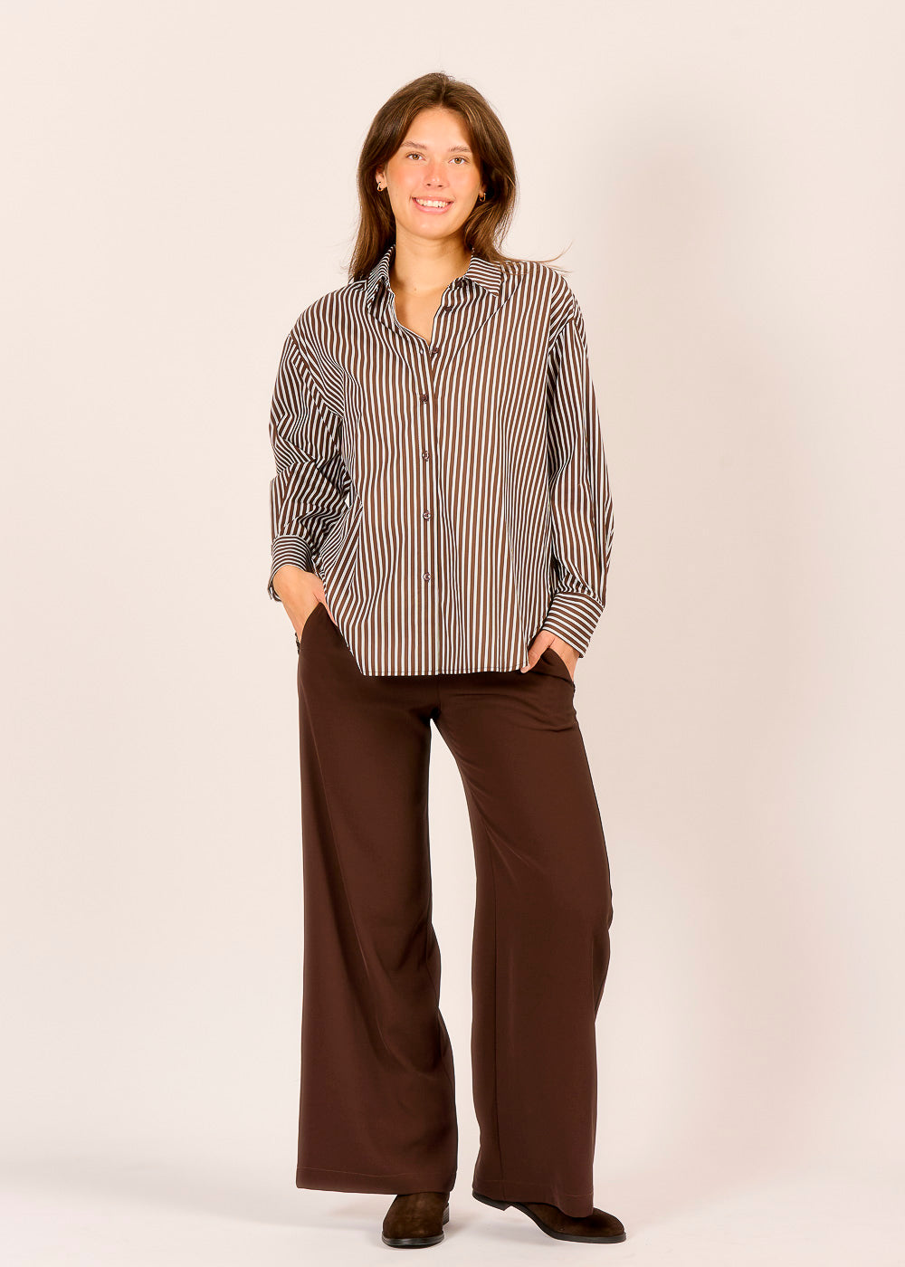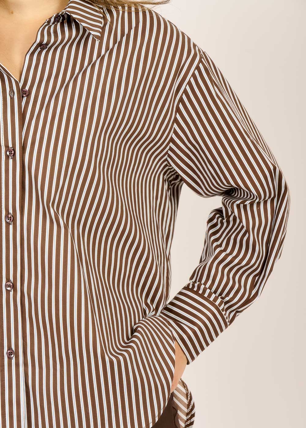 Die Streifenbluse in der Trendfarbe Mocca verbindet Eleganz und Dynamik. Ob lässig zur Stoffhose getragen oder unter einem Blazer kombiniert – diese Bluse ist für all die Momente gemacht, in denen du einen stilvollen, aber mühelosen Look tragen möchtest.