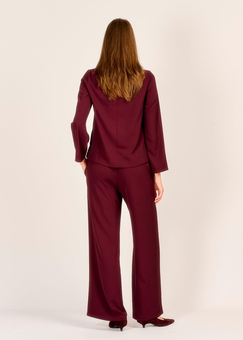 Eleganz trifft auf Raffinesse – dieses edle Blusenshirt in tiefem Vino ist ein stilvoller Begleiter für viele Anlässe. Hinten mit zwei dezenten Knöpfen veredelt und seitlichen Schlitzen versehen, bringt es Leichtigkeit und feine Details in dein Outfit. Ein feminines Must-have, das mühelos Chic und Komfort vereint.