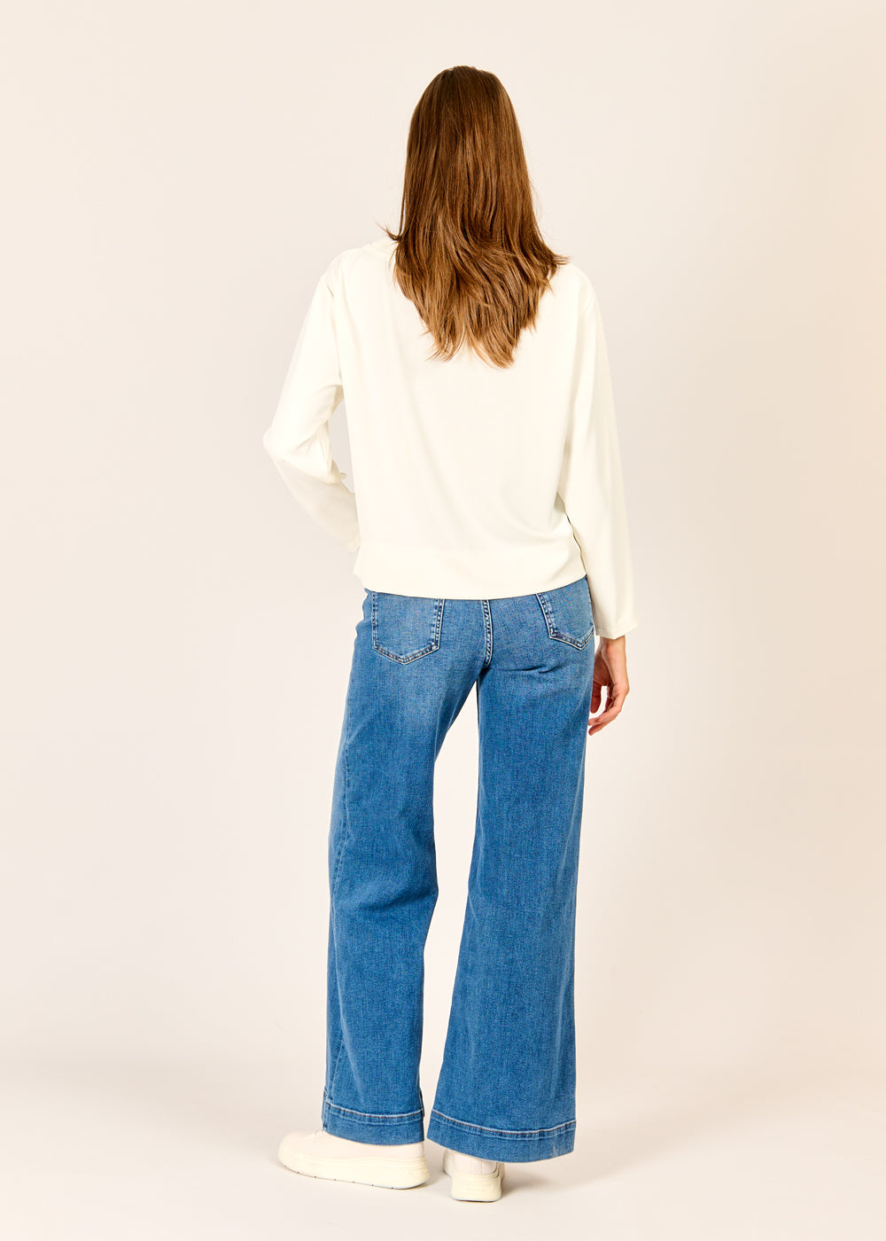 Dieses luxuriöse Langarmshirt in Crème-Weiß besticht durch seine schlichte Eleganz und den edlen U-Boot-Ausschnitt. Gefertigt aus einem fließenden Material, umspielt es sanft die Figur und bietet ein unvergleichlich angenehmes Tragegefühl. Ein vielseitiges Basic, das sowohl solo als auch unter einem Blazer getragen werden kann und jedem Outfit eine raffinierte Note verleiht.
