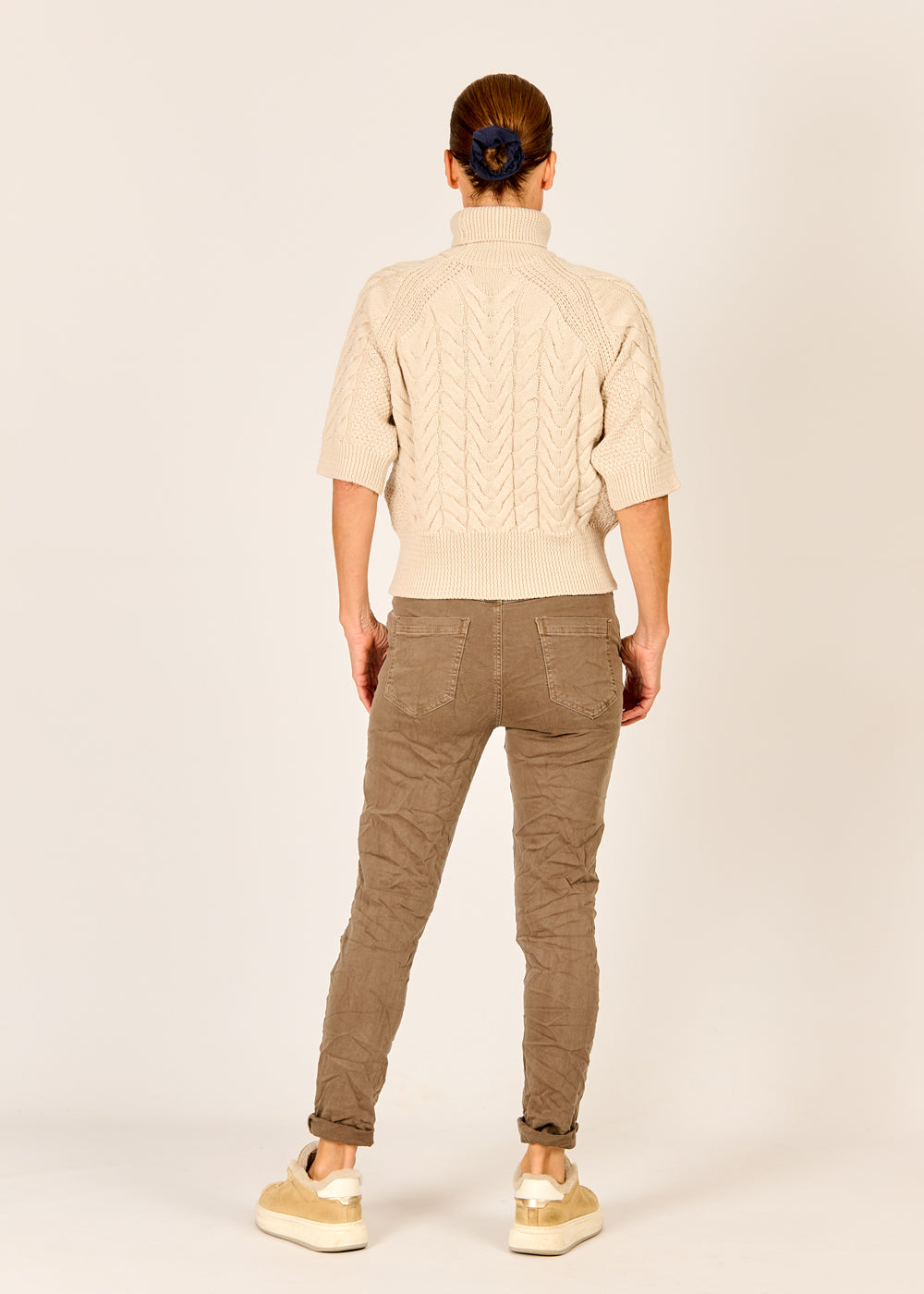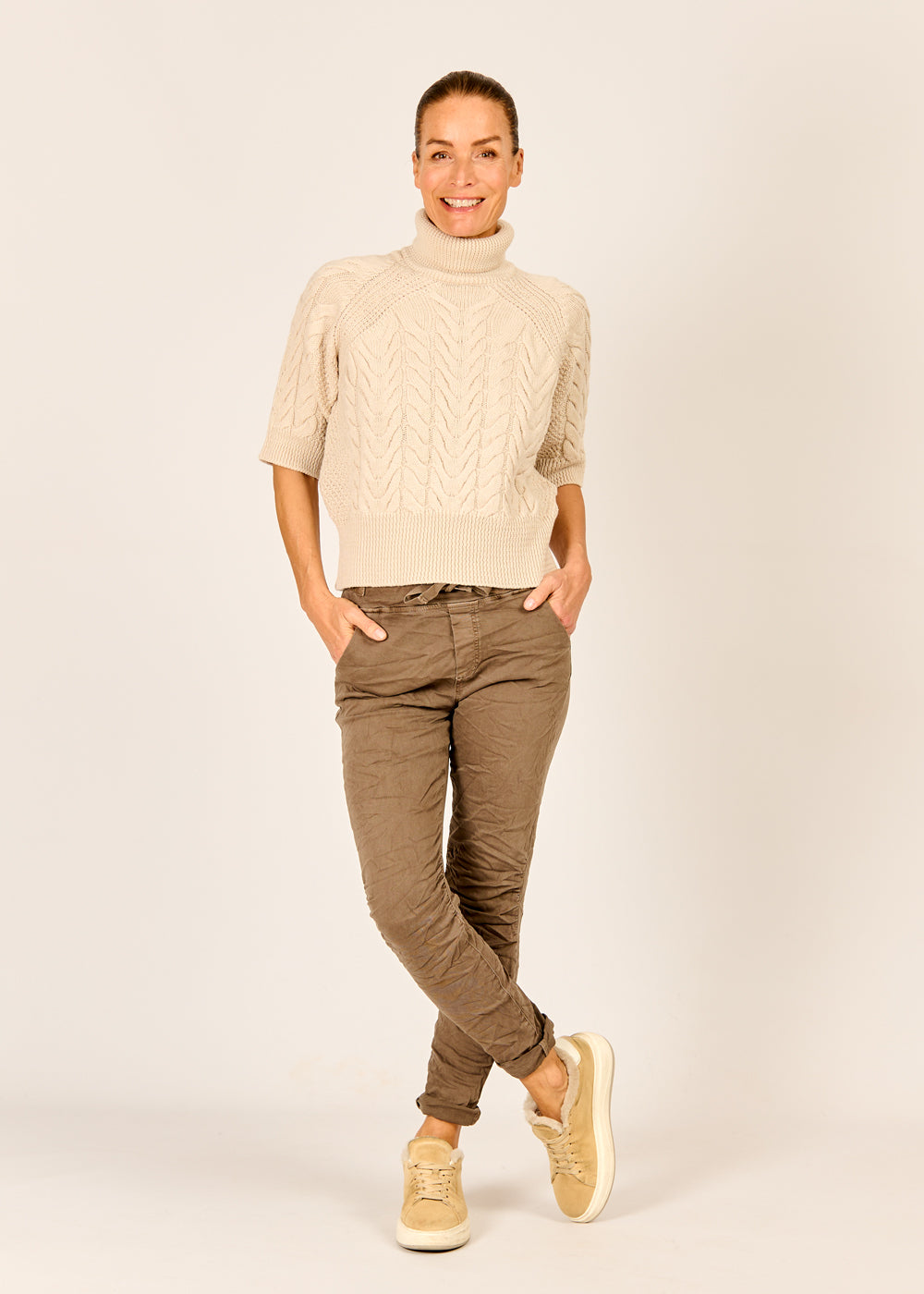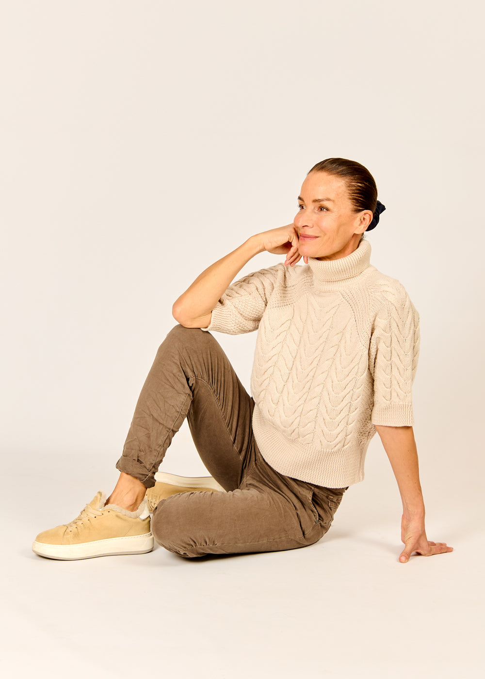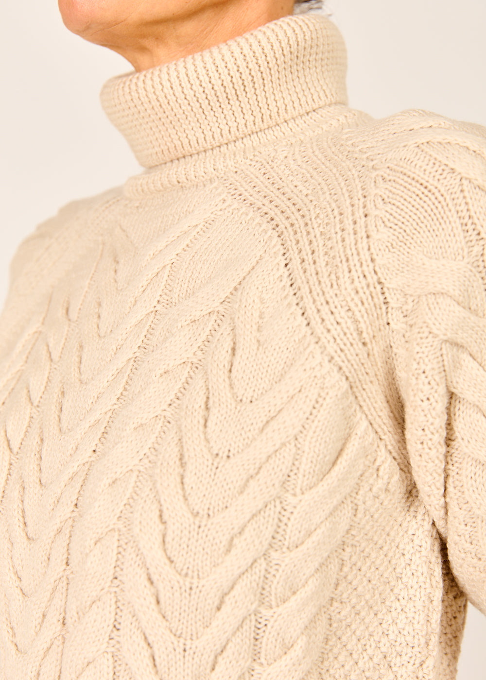 Dieser luxuriöse Zopfpullover in zartem Avorio (Elfenbein) ist ein wahres Meisterstück der Strickkunst, das mit seinem komplizierten Muster sofort ins Auge fällt. Die aufwendige Zopfstrick-Textur verleiht dem Pullover eine reiche Dimension und einen zeitlosen, eleganten Charakter. Mit seinem wärmenden Rollkragen und den halblangen Ärmeln ist er das perfekte Übergangsteil, das sich stilvoll zu Hosen und Röcken kombinieren lässt.