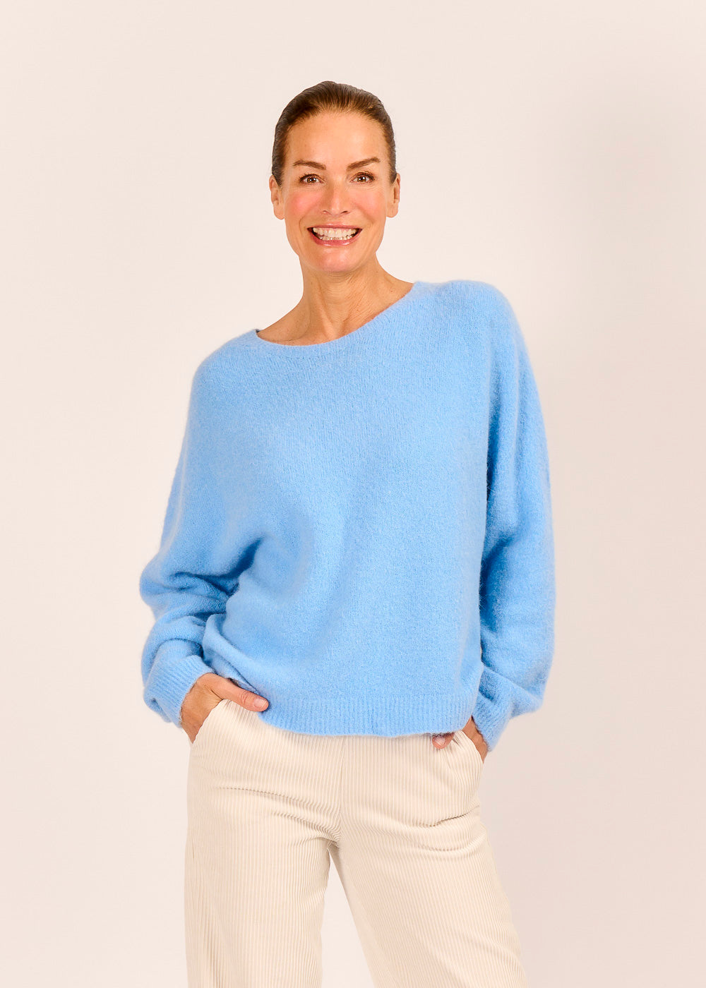 Kuscheliger trägt es sich nicht: Wie eine sanfte Umarmung umhüllt dich der hellblaue Wohlfühlpullover. Die frische Farbe lässt dich strahlen und der lockere Schnitt sorgt für einen lässigen Auftritt.