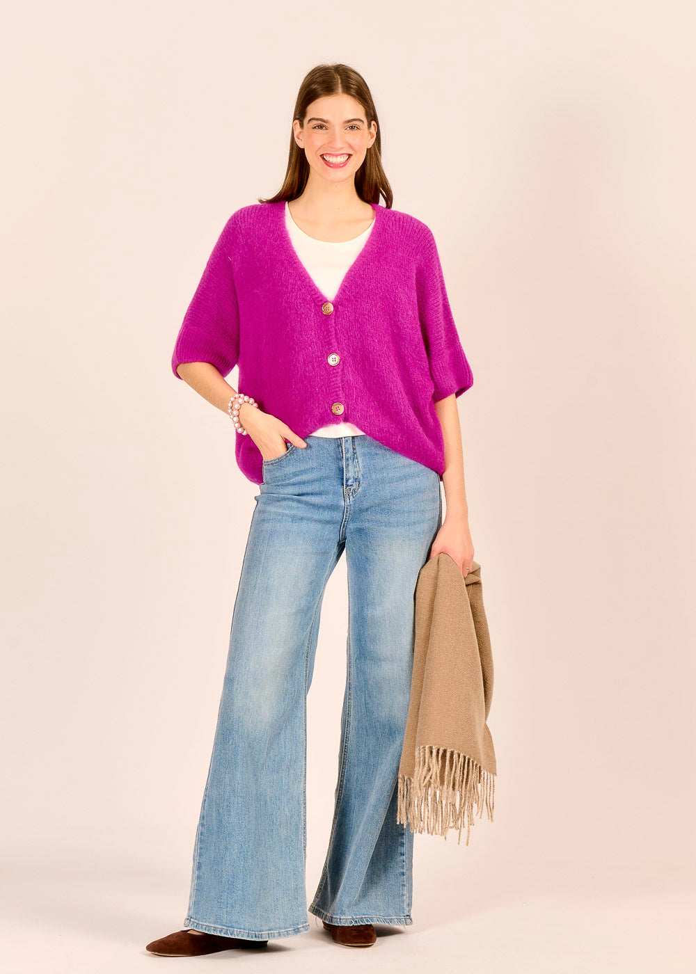 Dieser lässige Strick-Cardigan in leuchtendem Fuchsia zieht garantiert alle Blicke auf sich. Ein selbstbewusstes Lieblingsstück für alle, die Farbe lieben und Lust auf den Frühling haben. Bis die Temperaturen wieder steigen, hält dich das weiche Strickmaterial angenehm warm.