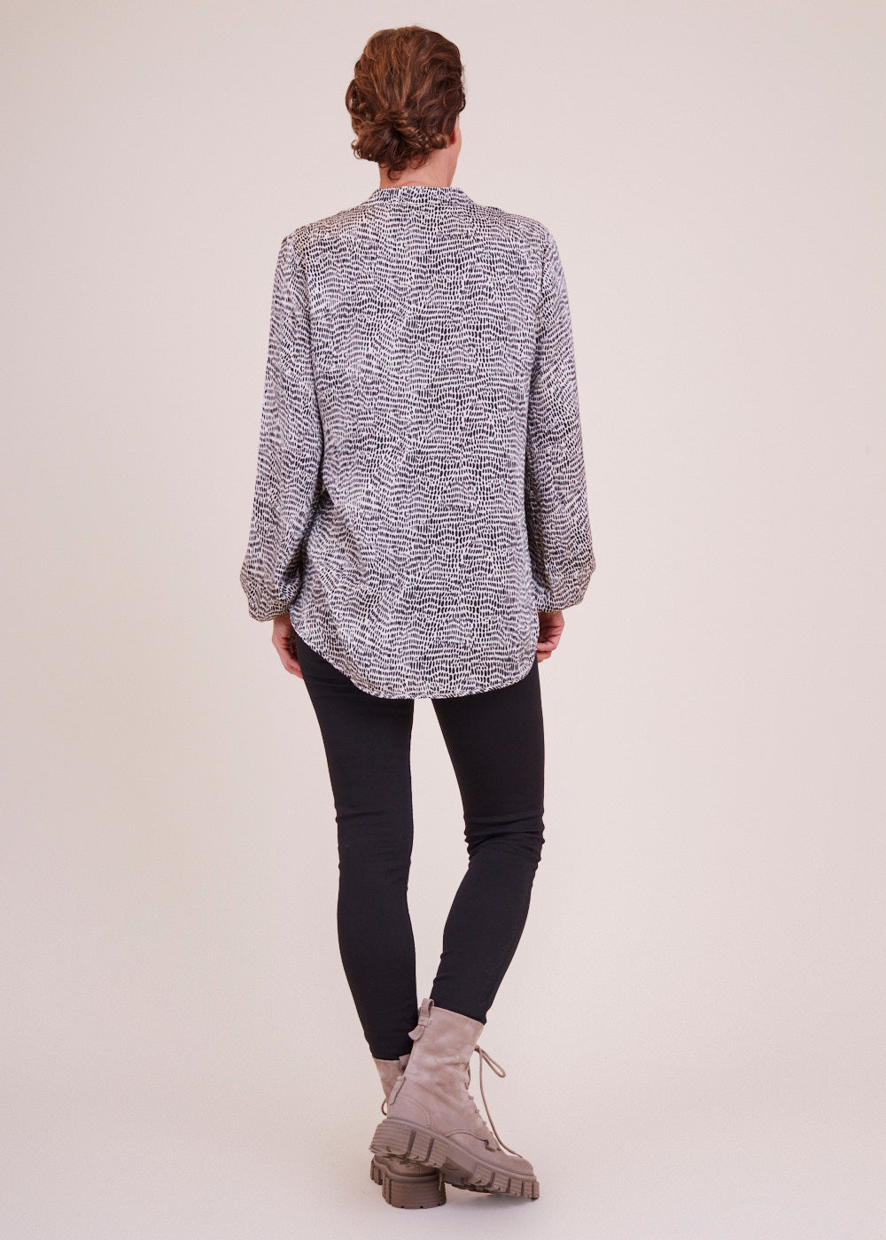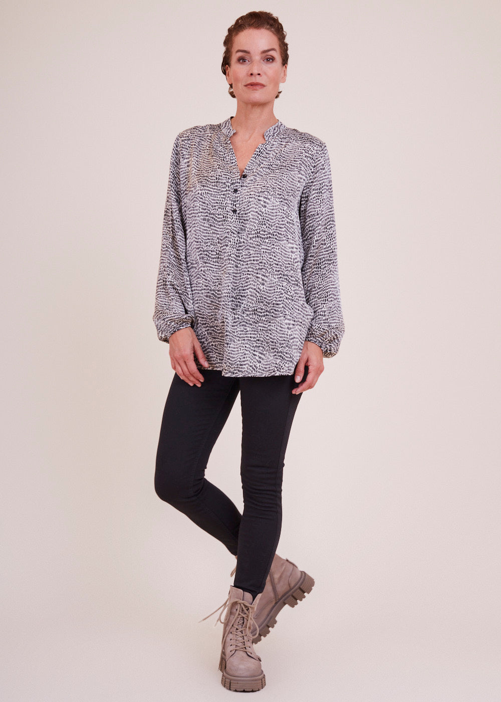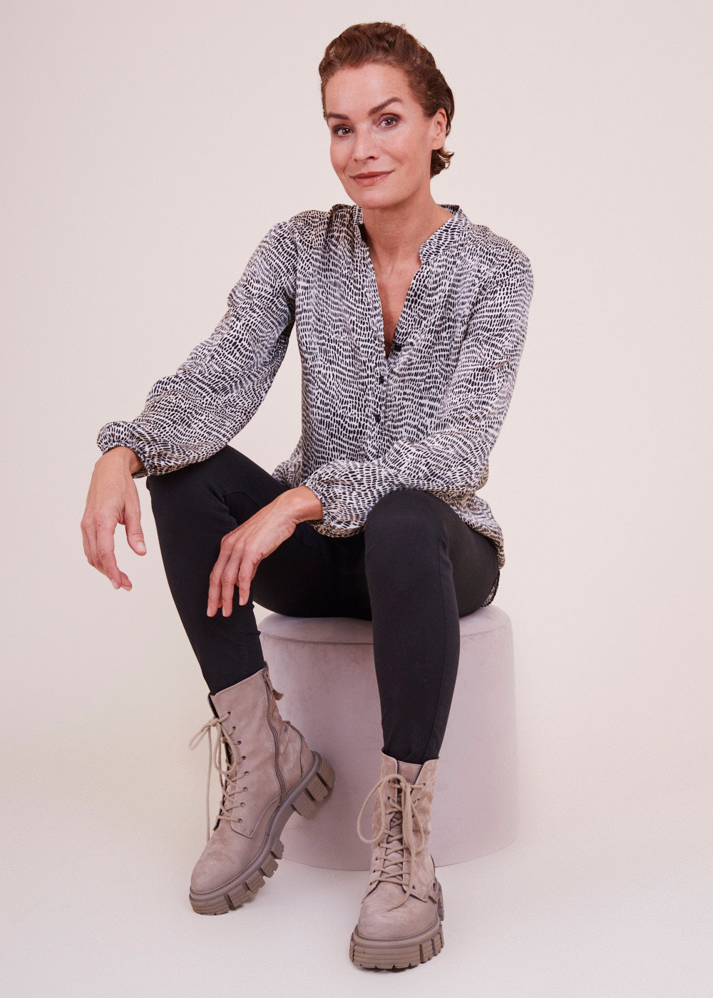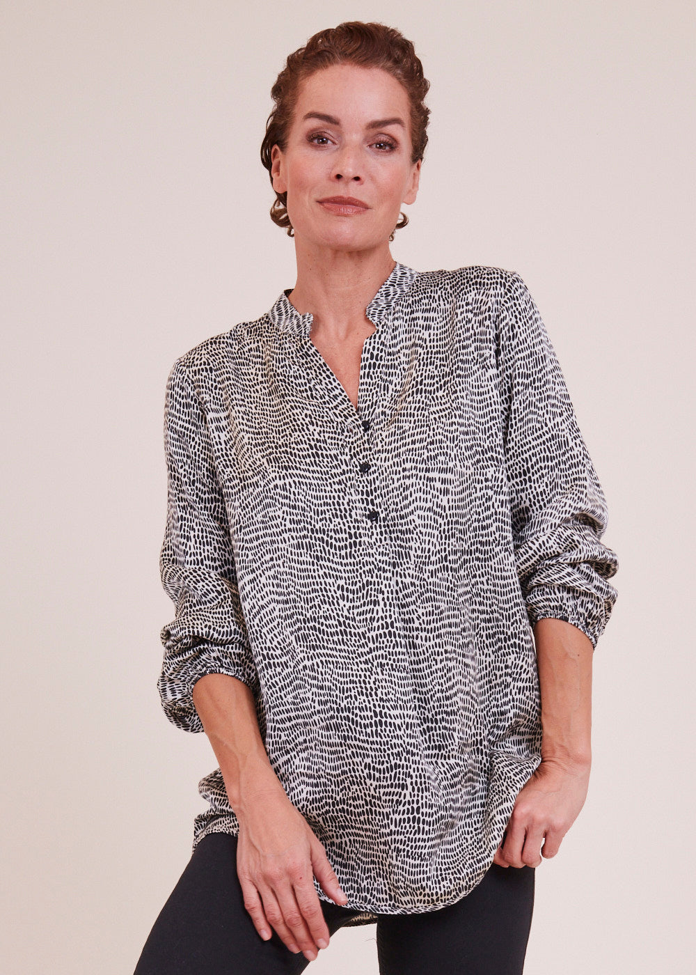 Fließende bedruckte Tunika aus einem großartigen Viskosematerial. Etwas länger und legerer geschnitten mit Knopfleiste und Manschette an den Armen. In den neuen einem großartigen Print und absoluter Hingucker.