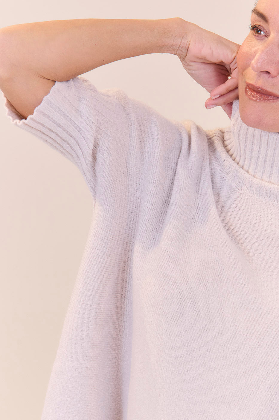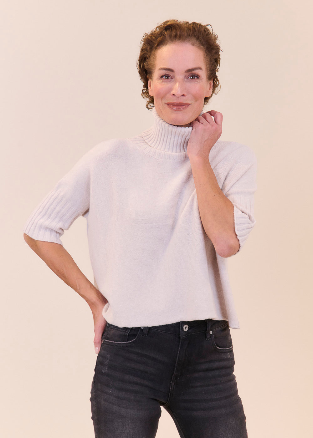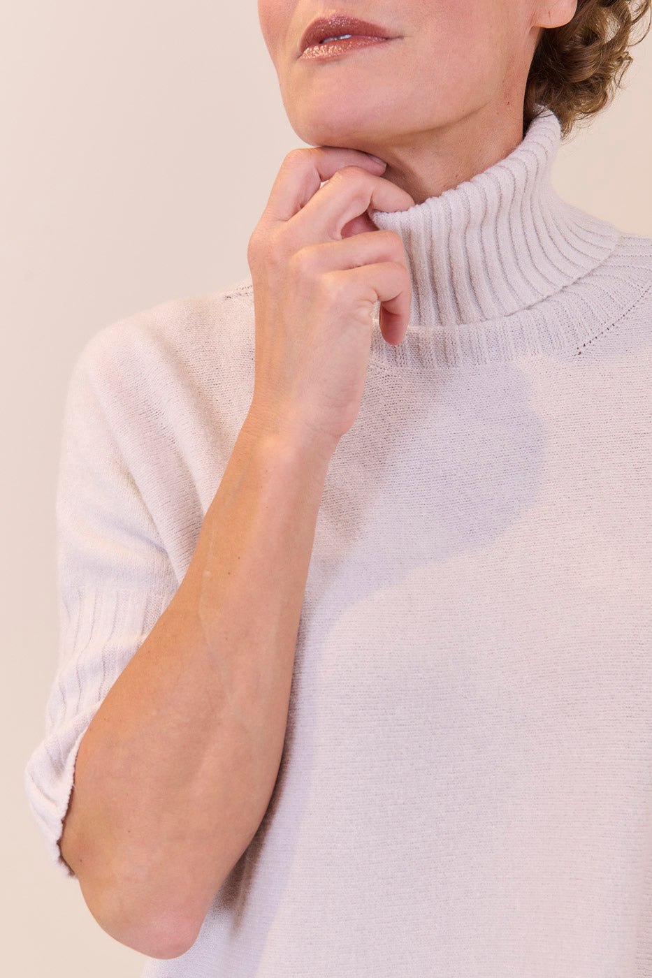 Kurz geschnittener Strickpullover mit Rollkragen aus unserem Kuschelgarn. Er hat ein Rippenbündchen am Kragen und an den Ärmeln. Mit kurz geschnittenen Armen.