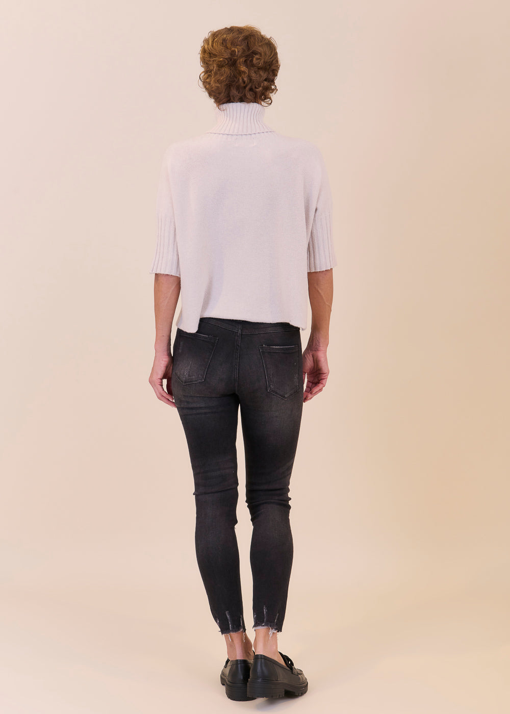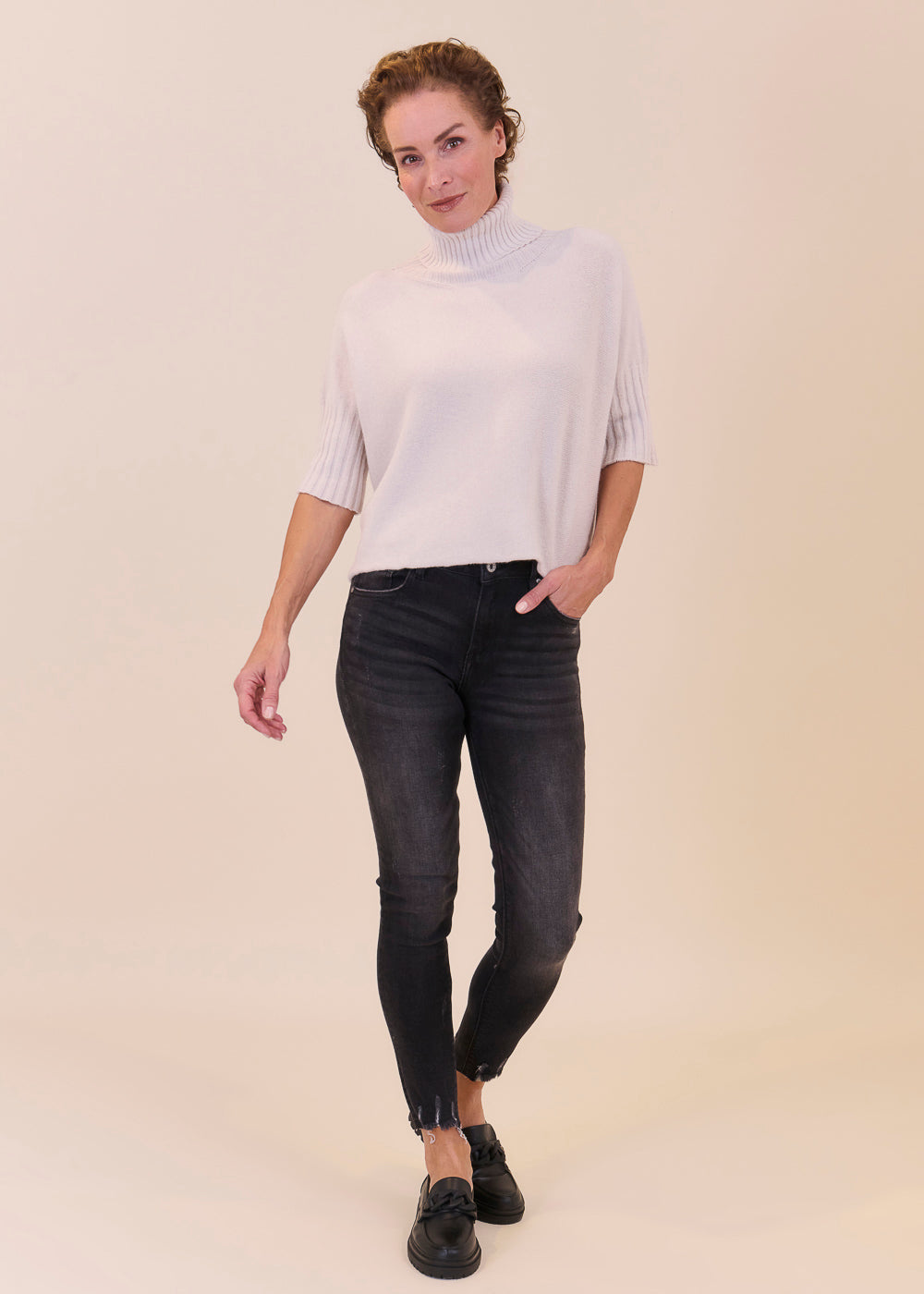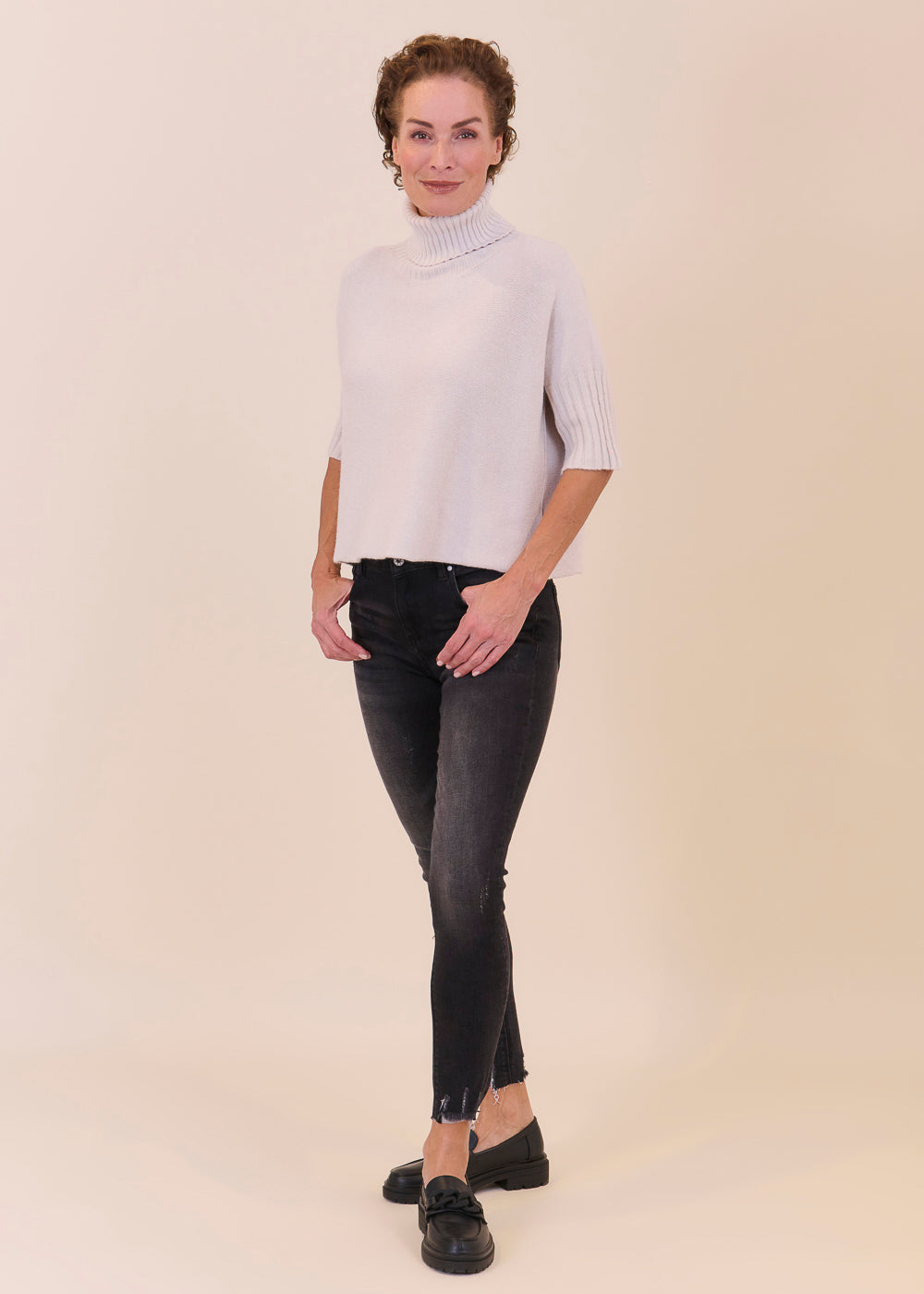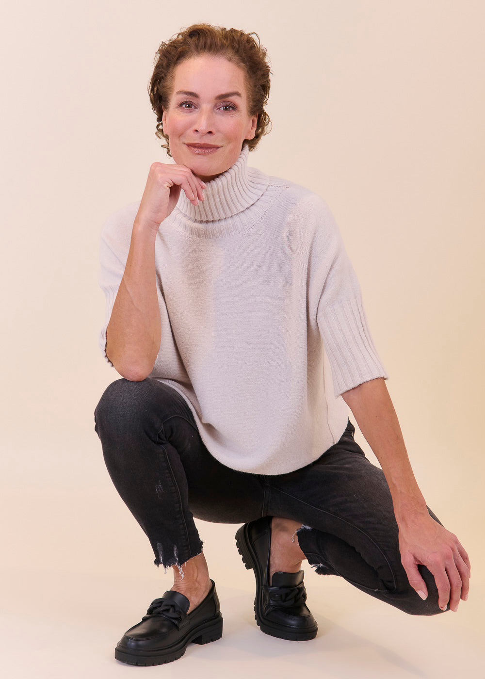 Kurz geschnittener Strickpullover mit Rollkragen aus unserem Kuschelgarn. Er hat ein Rippenbündchen am Kragen und an den Ärmeln. Mit kurz geschnittenen Armen.