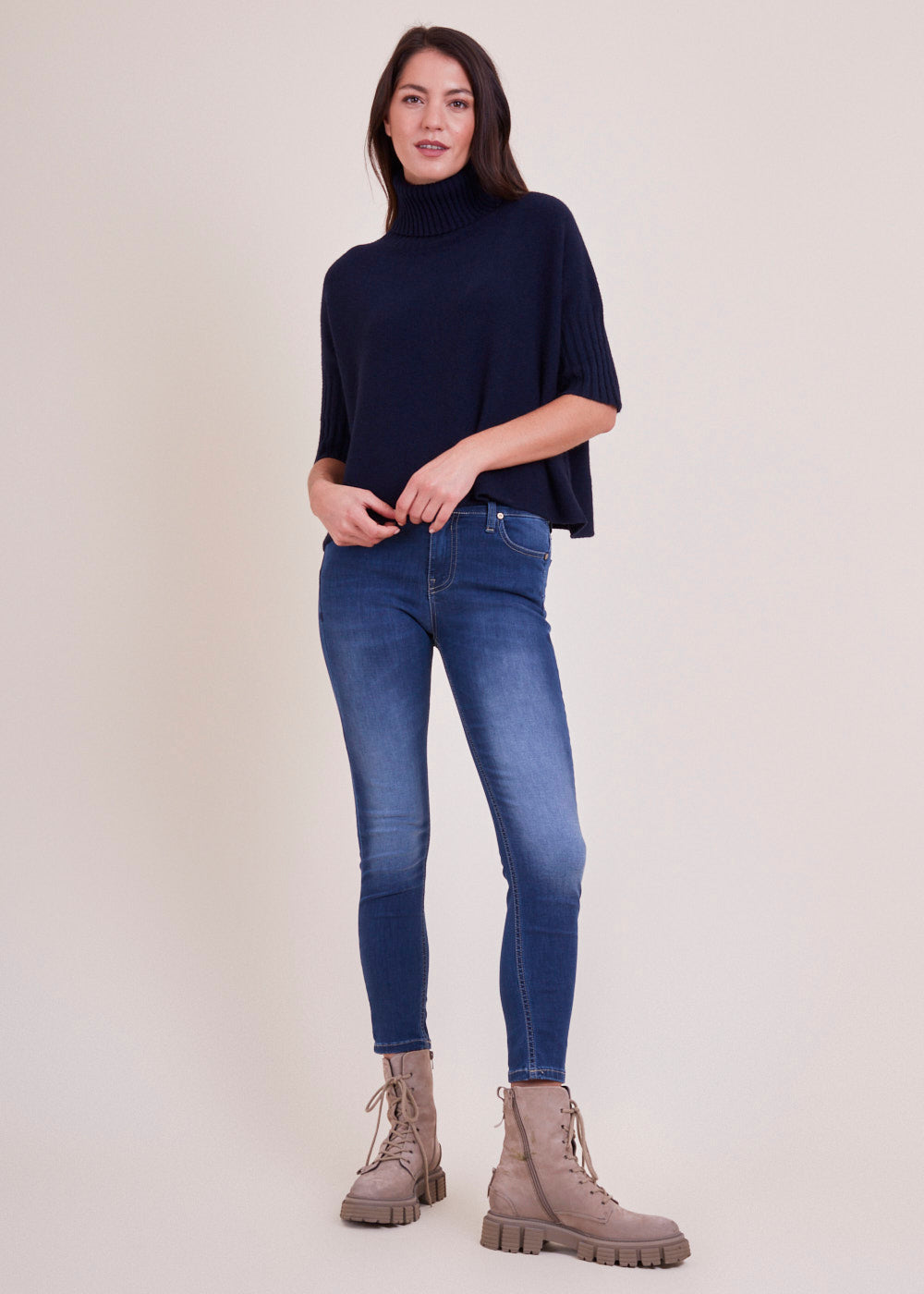 Kurz geschnittener Strickpullover mit Rollkragen aus unserem Kuschelgarn. Er hat ein Rippenbündchen am Kragen und an den Ärmeln. Mit kurz geschnittenen Armen.