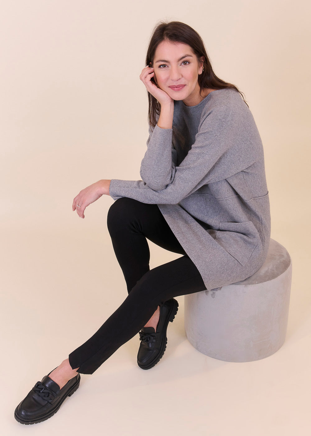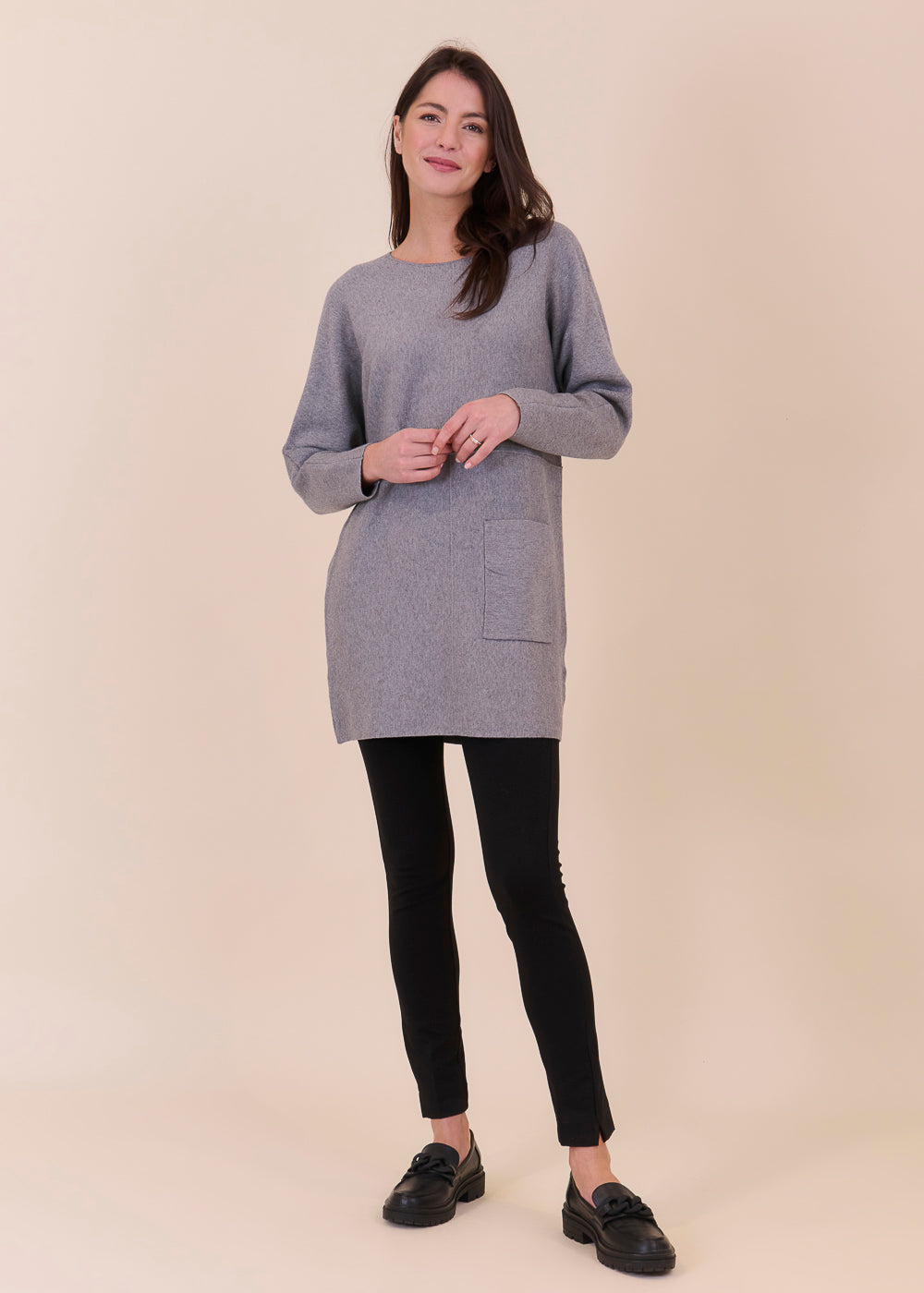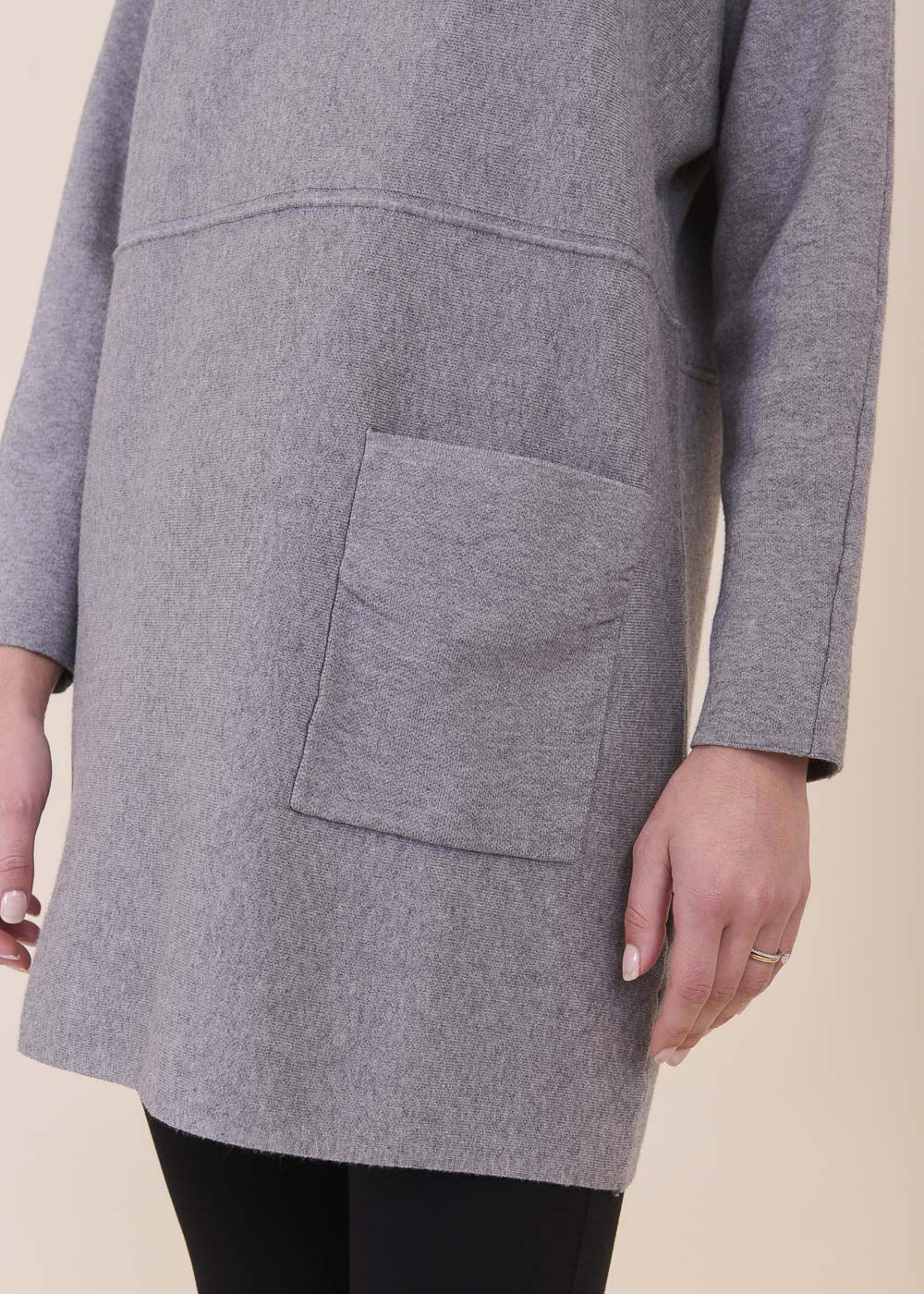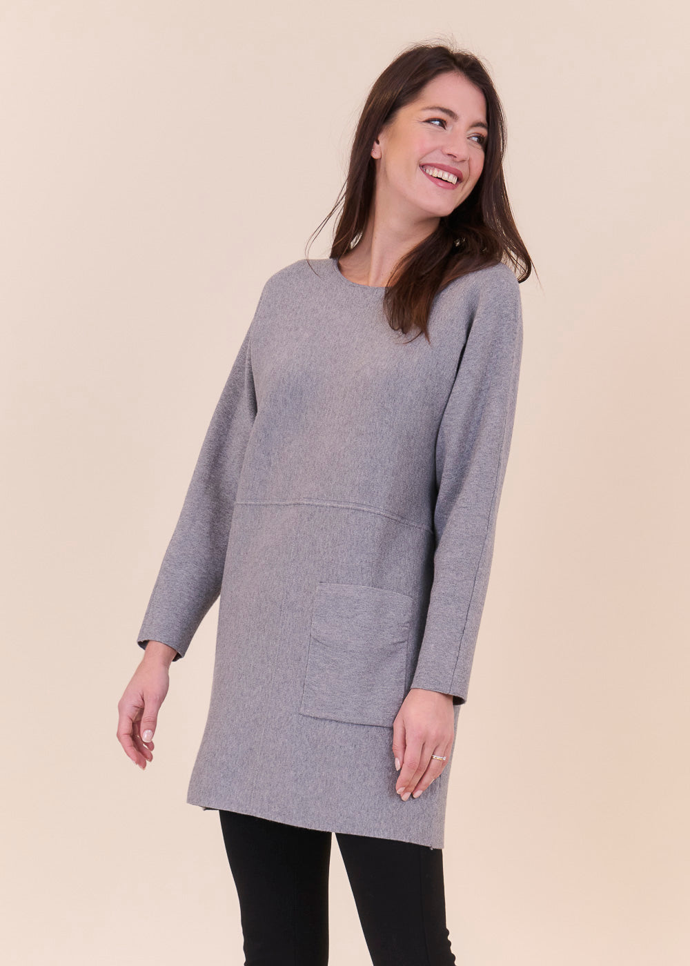 Lässig geschnittenes Strickleid aus unserem Kuschelgarn. Es hat lang geschnittene Arme und besondere Nahtdetails. Die aufgesetzten Taschen geben dem Kleid eine gewisse Lässigkeit.Einfach zum Wohlfühlen!