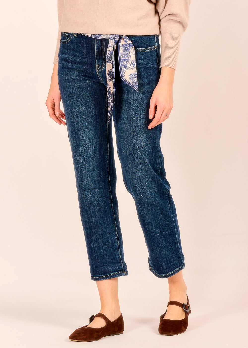 Dunkles Denim steht für klassische Eleganz und wird durch ein Tuch als Gürtel zum modernen Blickfang. Das Detail setzt einen stilvollen Akzent und verleiht deinem Look eine persönliche Note. Eine Jeans für alle, die das Besondere im Alltag schätzen.