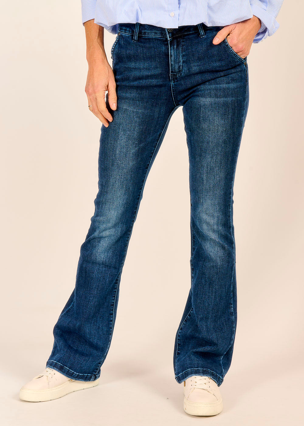 Die dunkelblaue Bootcut Jeans mit Stretch und Ziertaschen am Gesäß schmeichelt der Silhouette und streckt das Bein. Dunkles Denim wirkt zeitlos und ist der perfekte Stylingpartner.