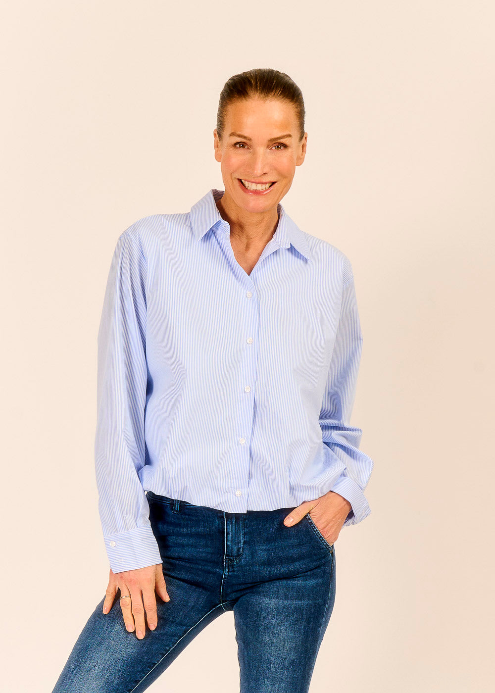 Die Streifenbluse aus einem leichten Baumwoll-Mix begleitet dich stilvoll durch den Tag. Die feinen Streifen verleihen dem Look klassische Eleganz, während der helle Blauton wunderbar frisch und zeitlos wirkt. Der geschoppte Bund sorgt für eine entspannte Silhouette und lässt deinen Look lässig und modern zugleich wirken.