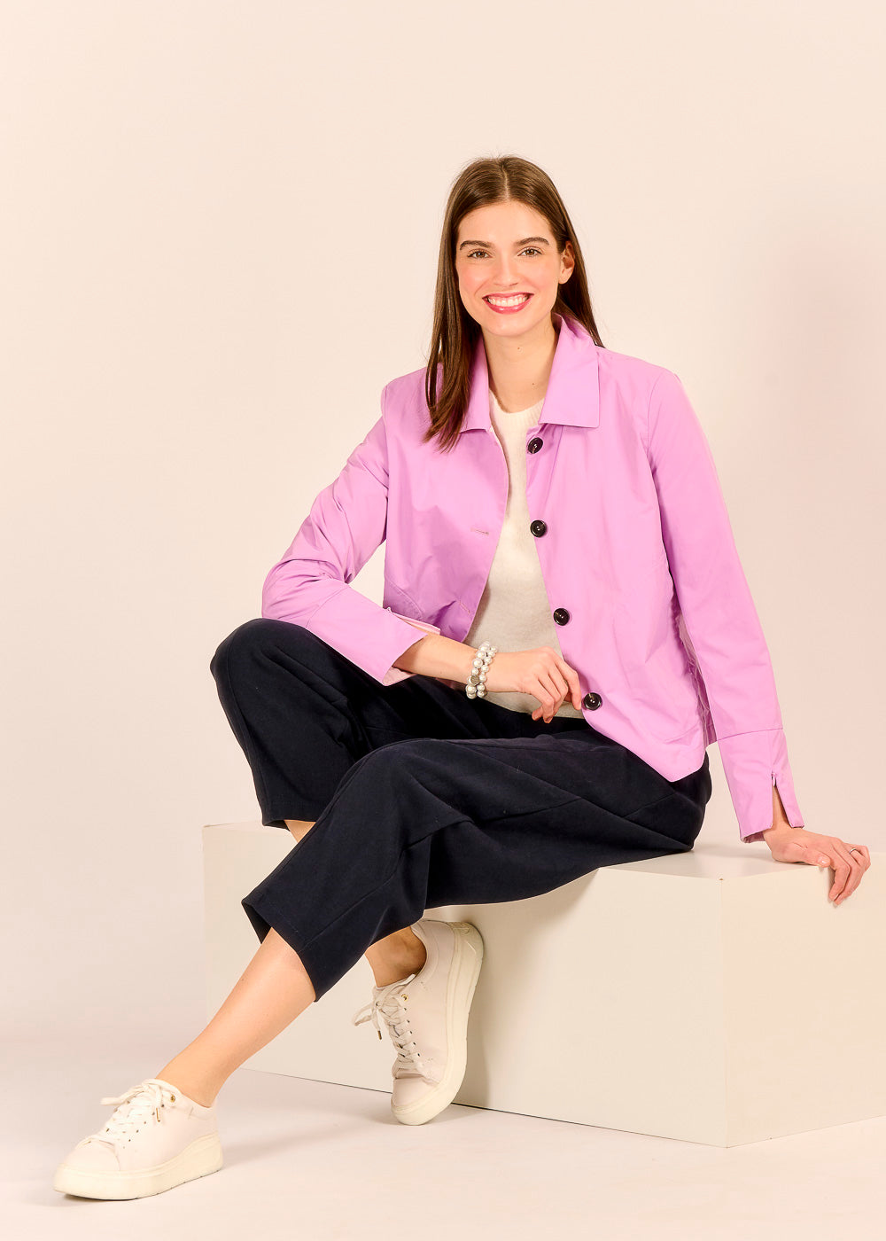 Die violette Blazerjacke mit Knöpfen setzt ein farbenfrohes Statement und sorgt für einen frischen, femininen Look. Durch raffinierte Details wirkt das Design stilvoll und lässig zugleich.