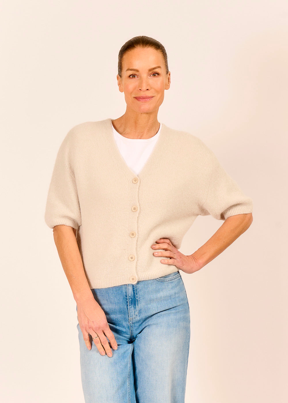 Dieser Halbarm Cardigan mit Baby Alpakawolle vereint zeitloses Stilbewusstsein mit einem angenehmen Tragegefühl, denn der Schnitt wirkt modern und entspannt zugleich.